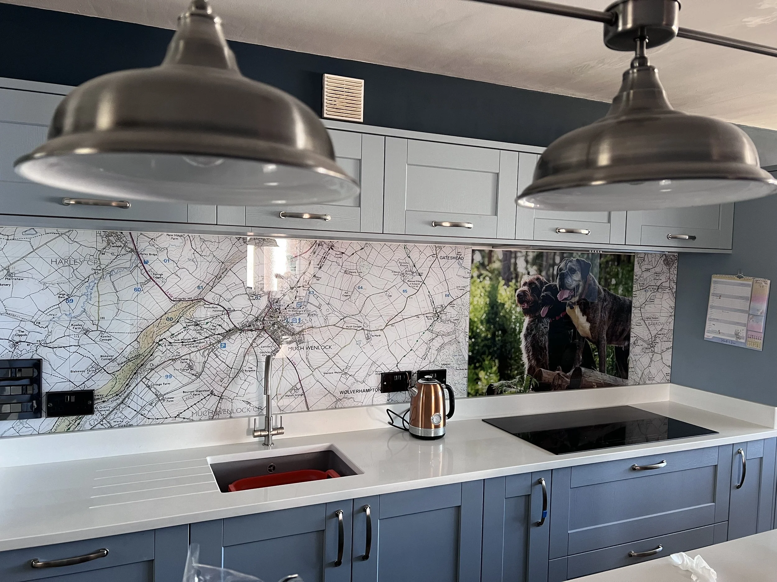 Two things I would like to mention about the Kitchen Splashback above. The first is you can see the four plug sockets are cut out to the left and right of the sink. The second is our client asked us for a second smaller piece on glass of her beloved dog who had recently passed away.